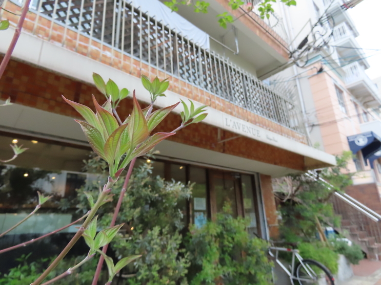 本店前のハナミズキもようやく開花。